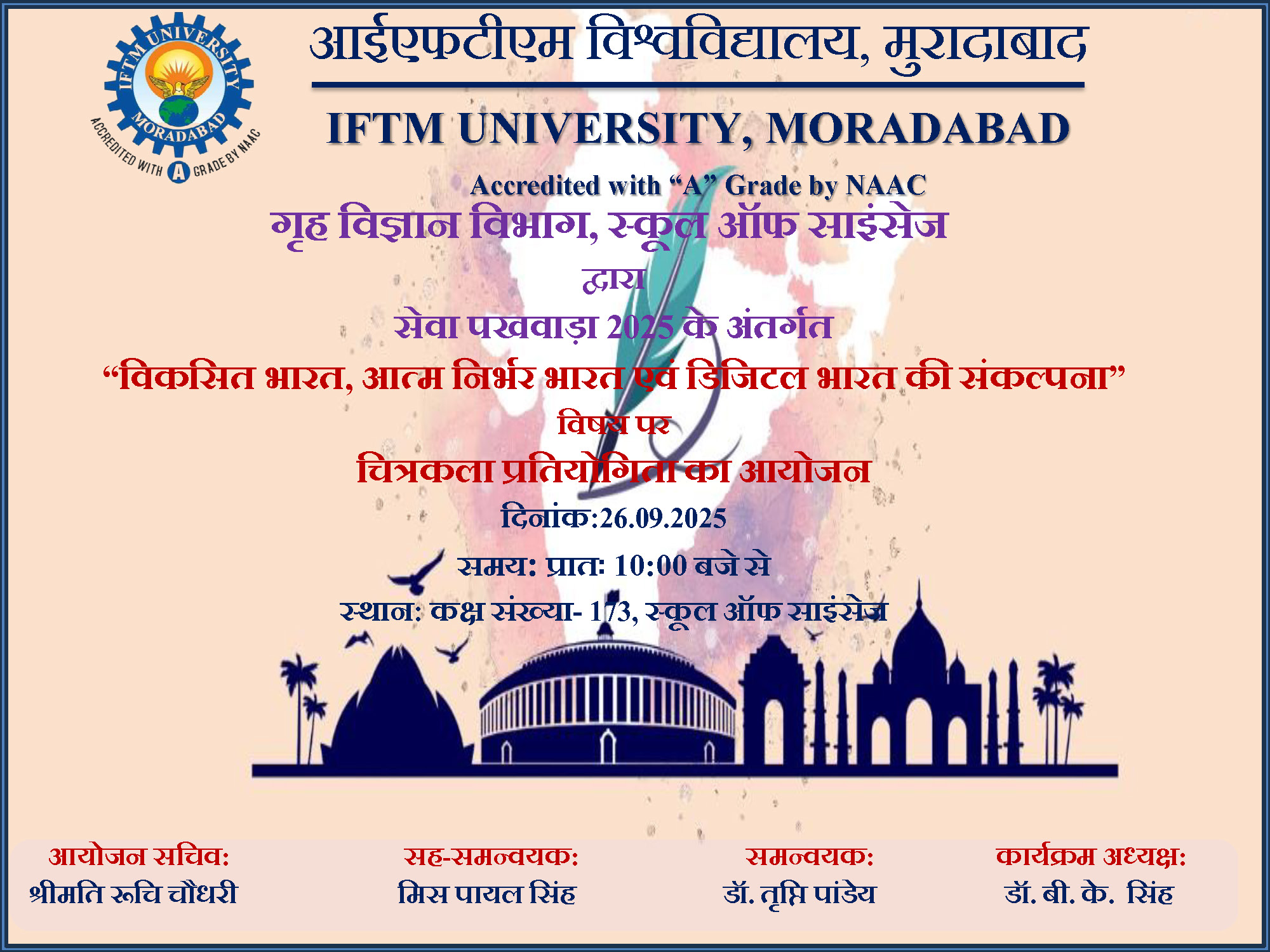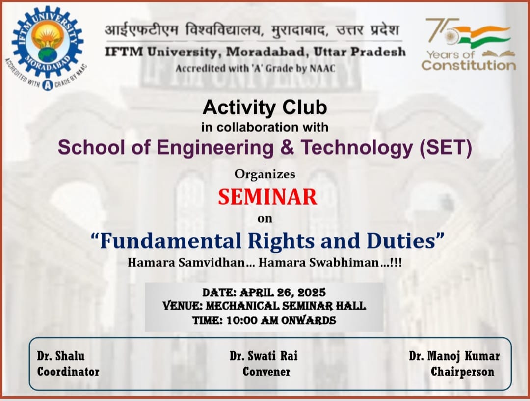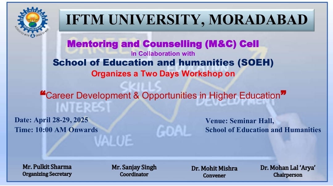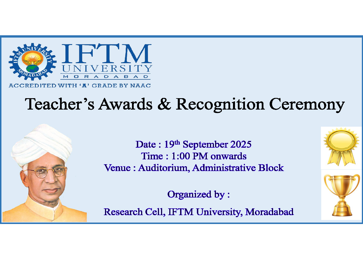IFTM University Provides an opportuniy to transform the mindset of its pupils by inculcating virtius and chiselling inherent qualities so that they become responsible citizens and leaders of tomorrow. Here they develop qualities such as courage, acumen, wit and enterprenaural craftmanship by organising Micro Teaching, Seminars, Debates, and Workshops along with live demonstration.