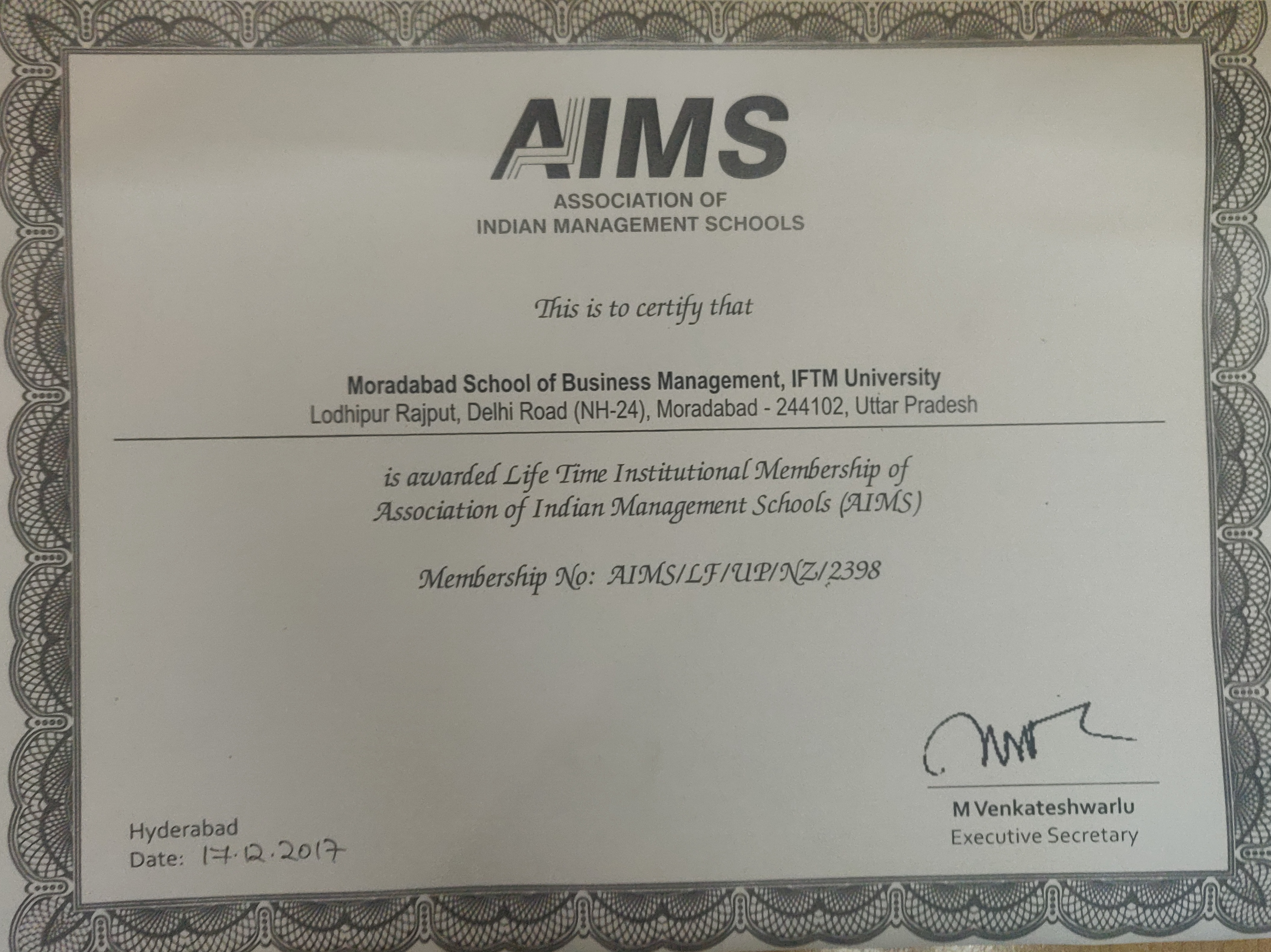 IFTM University is a life time institutional member of Association of Indian MAnagement Schools (AIMS). The Association of Indian Management Schools (AIMS) is a networking body of B-Schools in India for professional development of management education and safeguarding the interests of B-Schools in the country. As an independent networking body, AIMS can now boast of having many top class institutions like IIMs, ISB, ASCI, Xavier Institutions, Welingkar Institute of Management (WeSchool), NMIMS, ICFAI, MDI, S P Jain and many management departments of Universities as its members. It is the official representative of Indian Management Schools in India as well as in some important international forums. It is one of the largest networking bodies of B-Schools in the world.