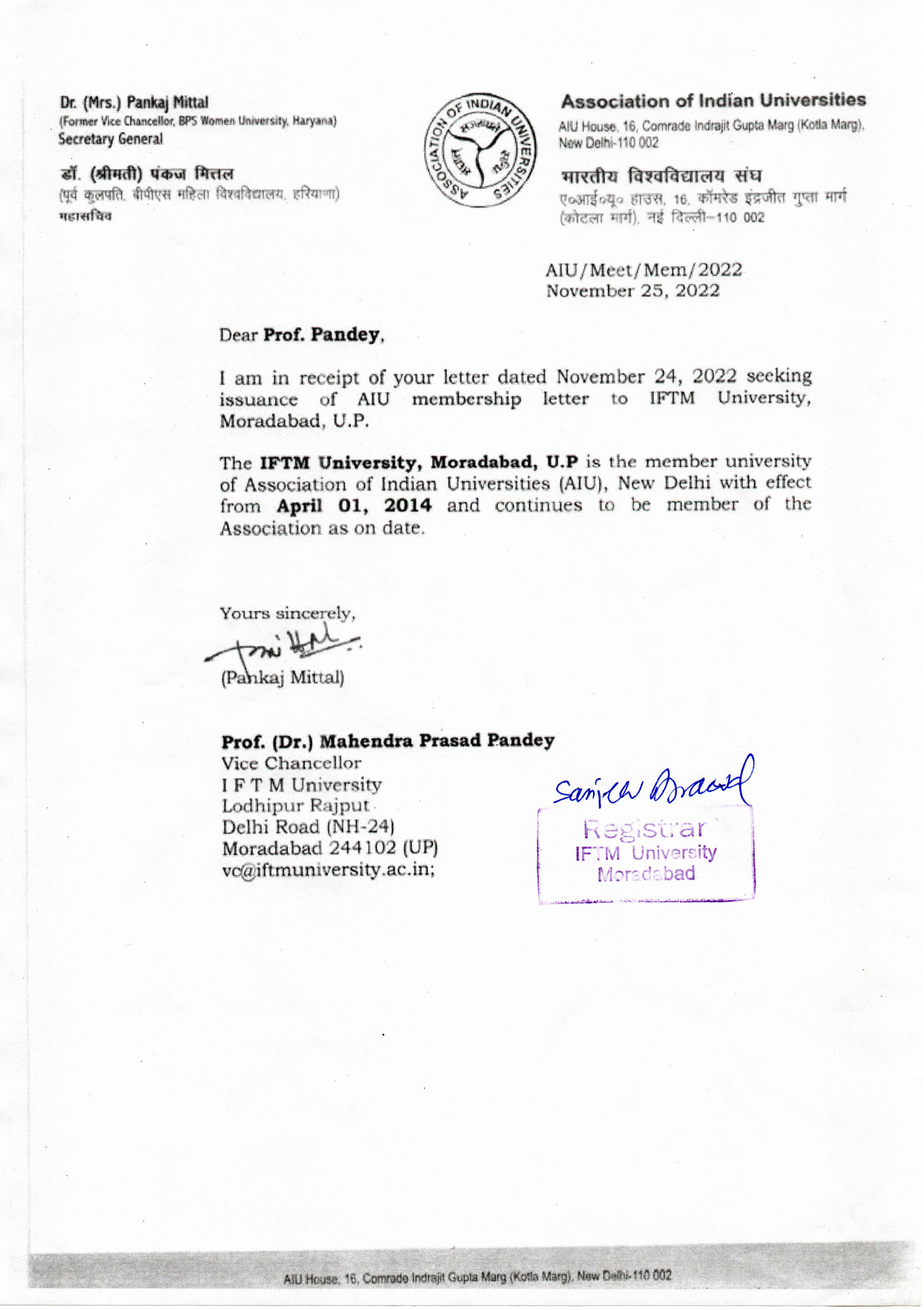 IFTM University was granted prestigious membership of Association of Indian Universities in 2014. Association of Indian Universities (AIU) is an organization and association of major universities in India.