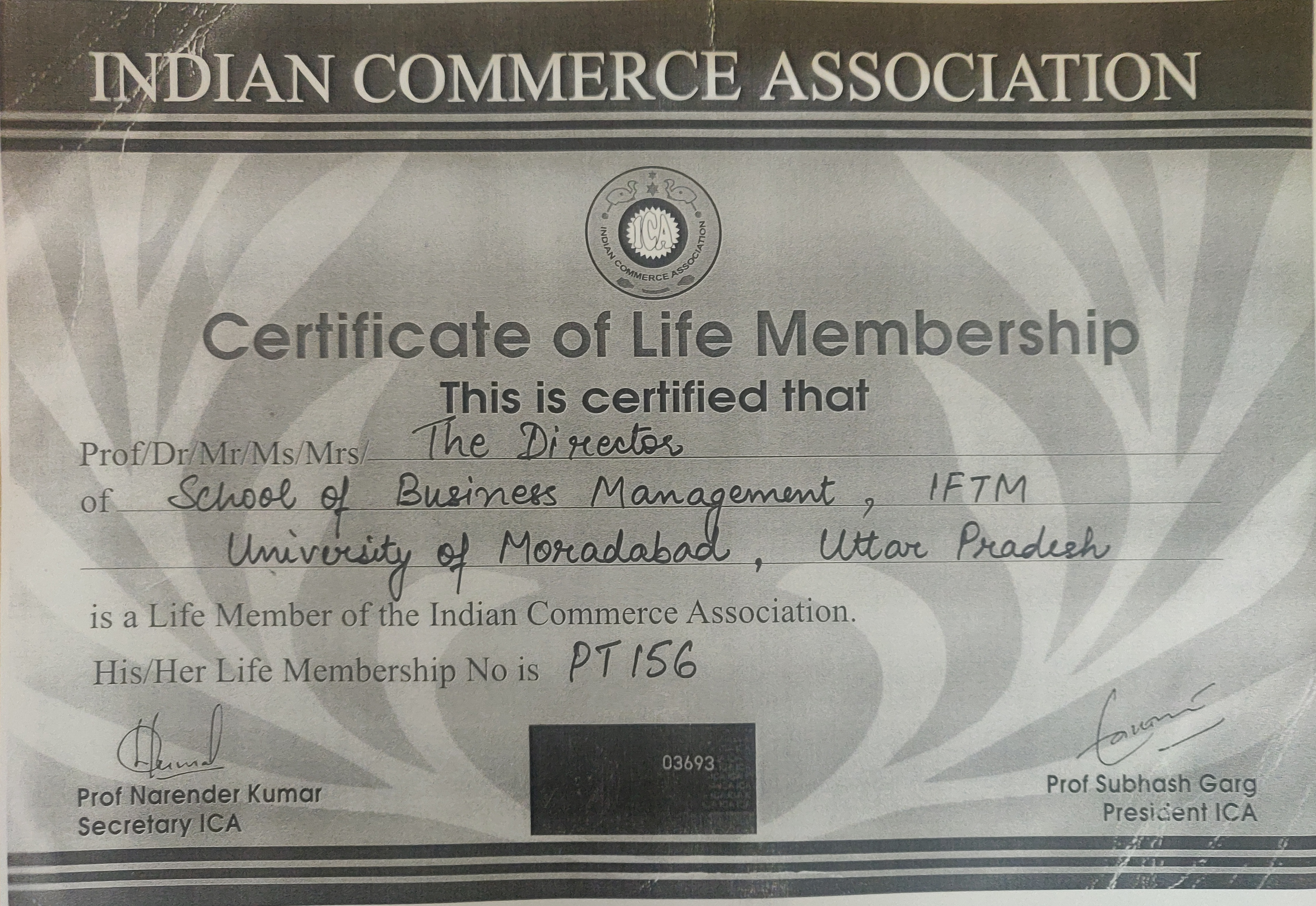 IFTM University is a life time member of Indian Commerce Assocaition (ICA) India. “The Indian Commerce Association (ICA)” was founded as oldest professional body in 1947, the year of national independence. It was formed as the cohesive group of Management Experts, Economists, Business Community persons and Technologists etc. This strong Association was strategically formed for conducting research, training, consultancy; organizing annual conferences and publication of journal. The theme behind foundation of association was to support the Indian corporate sector by enriching the academic arena of commerce.