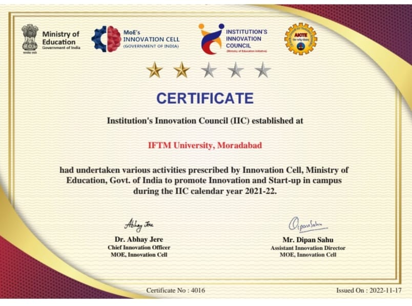 IFTM University has been recognized by MHRD Innovation Cell, Ministry of Human Resource & Development, Government of India for the establishment for “Institution’s Innovation Cell (IIC)” as per the norms of the innovation cell, to create a vibrant innovation and startup ecosystem at IFTM University, Moradabad.